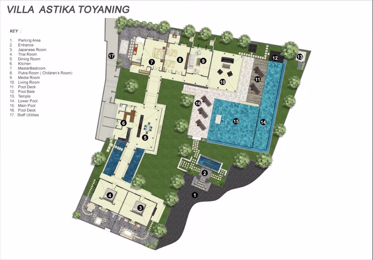 Die Villa Astika Toyaning bietet einen großen privaten Bereich von ca. 1.600 m2, 4 Schlafzimmer mit eigenem Bad (drei Doppelzimmer, ein Zweibettzimmer), einen separaten Esspavillon mit 12 Sitzplätzen zum Abendessen, einen offenen Wohnbereich und einen multimedialen, klimatisierten Fernsehraum. Rund um die Pools gibt es Sonnenliegen für 8 Personen sowie einen Entspannungspavillon am Ende des Sportbeckens. Der große offene Wohnbereich bietet Blick auf die Pools und den Garten. Villa Astika Toyaning bedeutet „schönes Wasser“. Astika steht für Schönheit und Minimalismus und Toyaning für sauberes Süßwasser.