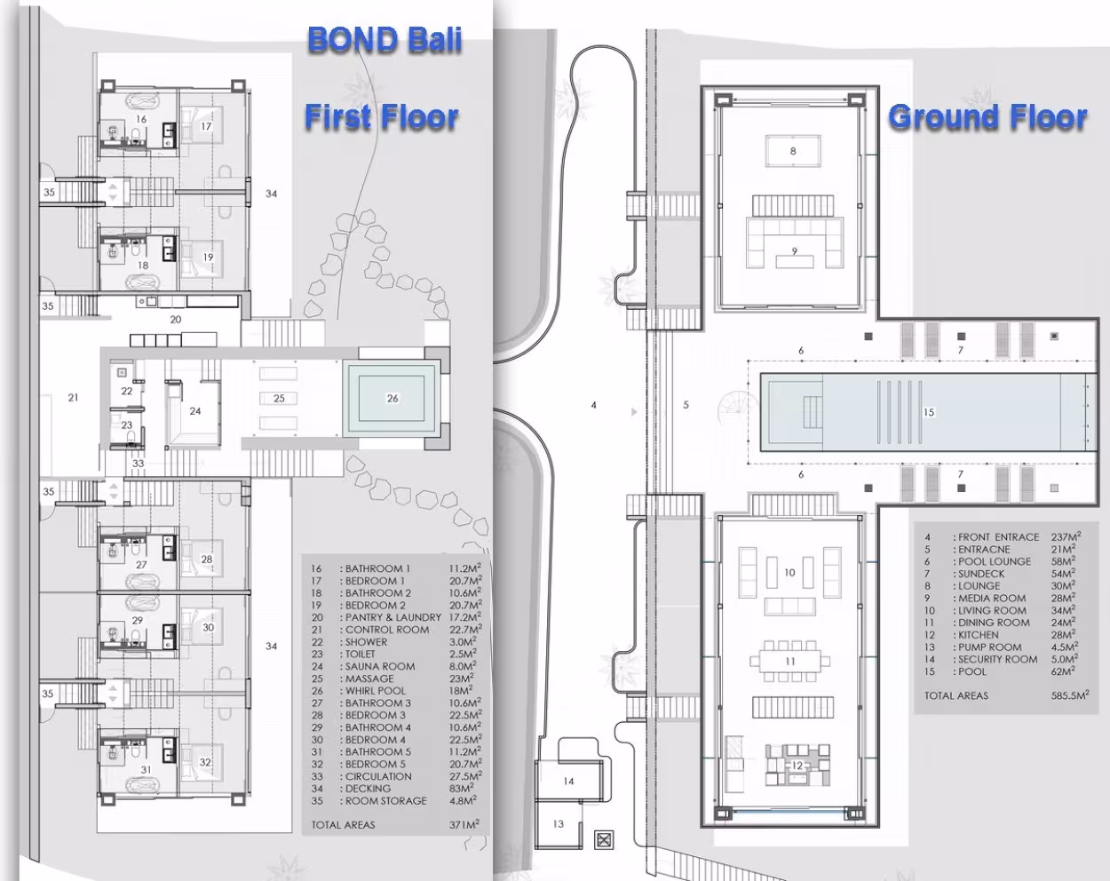 Mit zwei vollständig geschlossenen Wohnbereichen bietet BOND Bali flexible Möglichkeiten für unterschiedliche Gruppendynamiken und individuellen Raum. Einer der Wohnbereiche verfügt über einen Billardtisch, eine Kinoleinwand und ein großes Sofa mit Blick auf den Infinity-Pool, während der andere eine wunderschöne Holzesstafel für Gourmet-Mahlzeiten bietet, die vom privaten Chefkoch zubereitet werden.