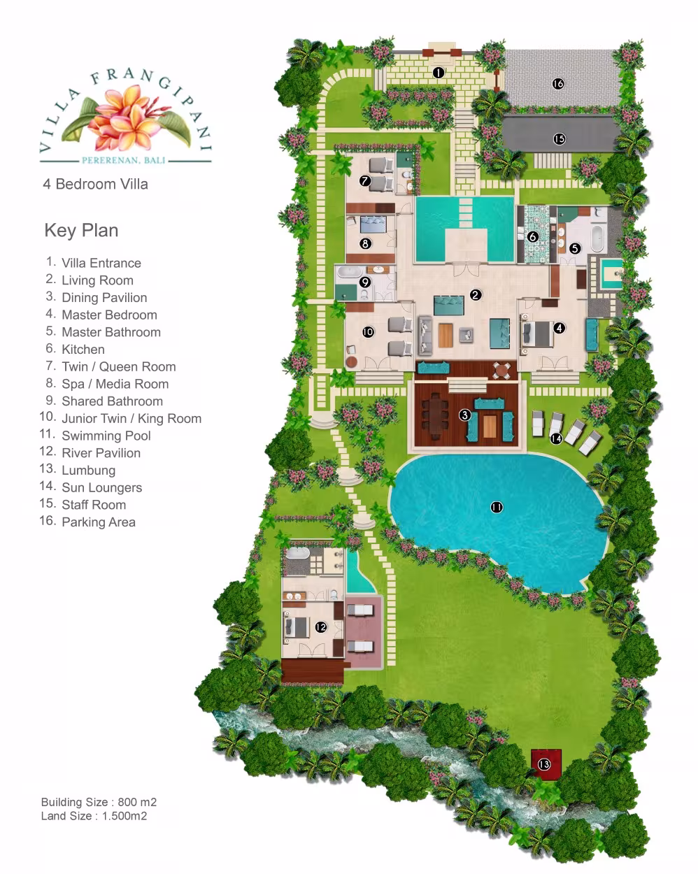 Villa Frangipani ist eine luxuriöse Mietvilla, die von derselben Gruppe entworfen und gebaut wurde, die das Four Seasons Bali errichtete – ein Resort, das vom Conde Nast Traveler Magazine als das beste der Welt ausgezeichnet wurde. Die Villa besteht aus einem Haupthaus sowie einem separaten Gäste-Pavillon. Im traditionellen balinesischen Architekturstil erbaut, verfügt diese geschmackvolle Immobilie über hohe, gewebte Bambusdecken, vier große Schlafzimmer, einen TV-Loungebereich sowie geräumige Innen- und Außenwohnbereiche. Drei der Schlafzimmer befinden sich in einem Gebäudetrakt und bieten alle einen herrlichen Blick auf die umliegenden tropischen Gärten.