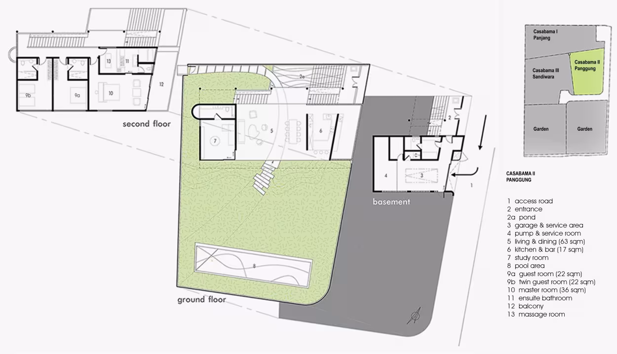 Inspirada en las aldeas tradicionales balinesas, la villa combina elementos arquitectónicos locales con un diseño moderno, un estilo elegante y una meticulosa atención al confort. La Villa Casabama II Panggung es completamente independiente, con entrada privada, terreno propio, garaje y piscina, pero sigue siendo fácilmente accesible a través de un portón común en caso de que los huéspedes tengan amigos en una villa vecina. Un gimnasio bien equipado y una sala de yoga, ubicados en la entrada del complejo, están disponibles para las tres villas del conjunto. Entre las villas y el océano se extiende un hermoso césped con palmeras de coco, ideal para bodas románticas y eventos especiales.