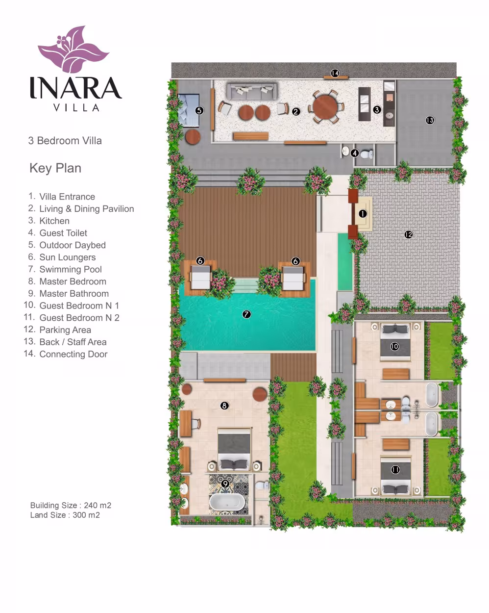 El primer impacto de la Villa Inara es inolvidable: cuando las puertas de madera se abren, revelan un paraíso privado para disfrutar en los próximos días y noches. El suave sonido del estanque de lotos acompaña la vista desde la entrada hasta la piscina, los dormitorios y el pabellón principal de estar y comedor.
