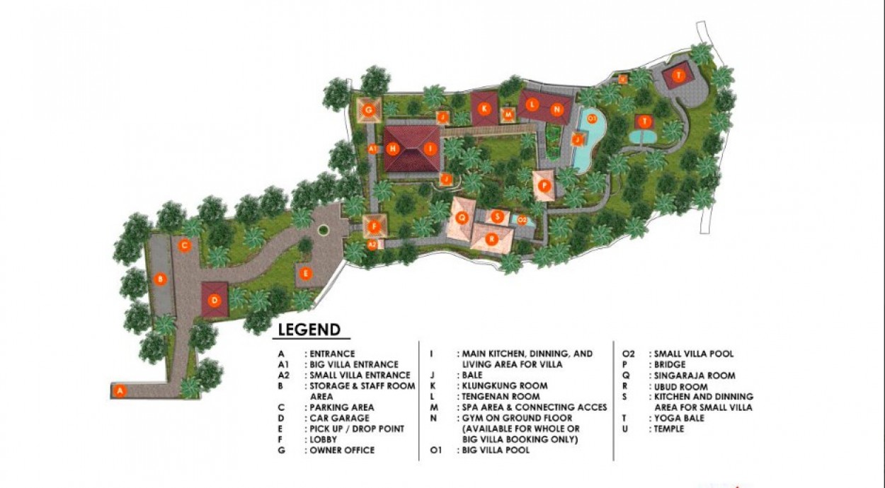 Открытая, полностью оборудованная кухня доступна для персонала, который может приготовить блюда по вашему запросу, или же гости могут готовить сами. В главном доме также находится кондиционированная мультимедийная комната / библиотека, оснащённая новейшей аудио- и видеотехникой. Четыре просторные спальни с кондиционерами расположены в отдельных павильонах, два из которых имеют общую открытую кухню и обеденный павильон, а также собственный бассейн с родниковой водой и террасу. В каждом павильоне есть меблированная веранда и ванная комната с душевой кабиной, а также небольшой закрытый сад с душем на открытом воздухе. Все спальни оснащены кабельным телевидением и DVD-плеером, а кровати застелены высококачественным хлопковым постельным бельём. Четыре павильона оформлены в разных стилях и названы в честь четырёх знаковых мест Бали: Tenganan, Klung Kung, Ubud и Singaraja.